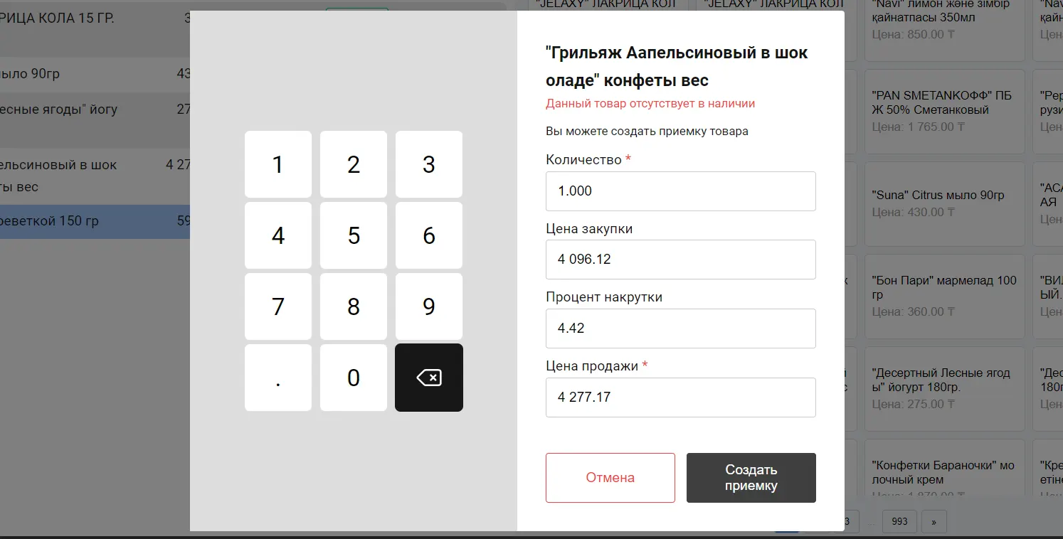 - Если товара нет на складе и его добавляют в корзину (через поиск, категории или быстрые товары), система открывает модальное окно «Создать приемку».
