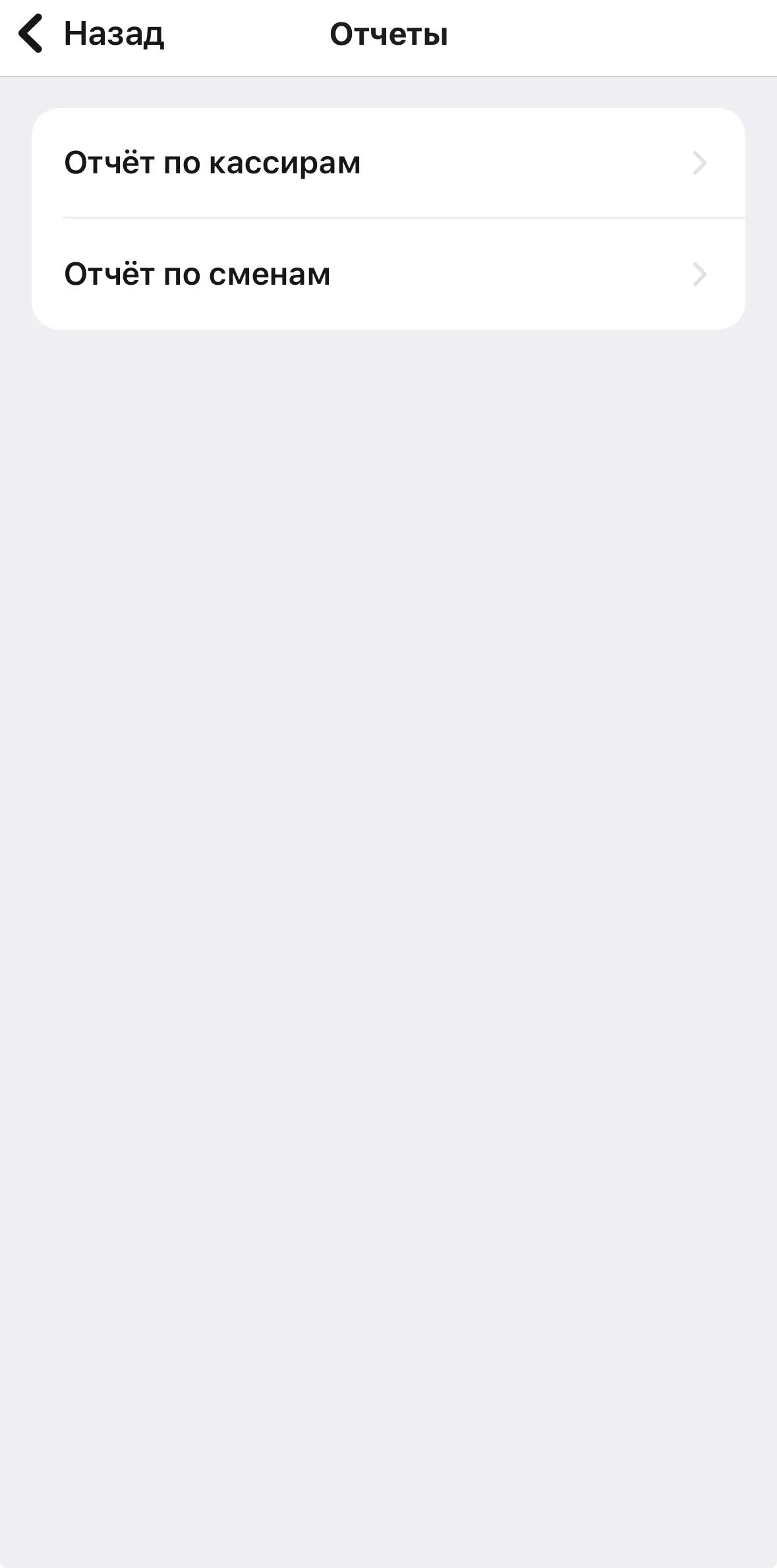- Отчёты по кассирам;