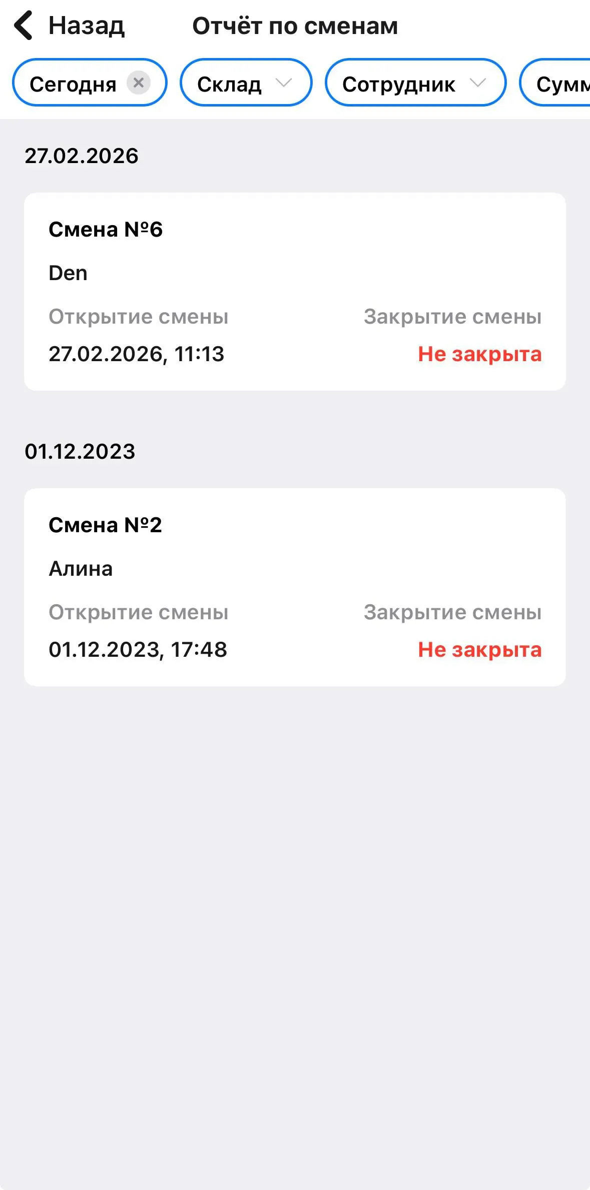 - Контроль закрытия смен.