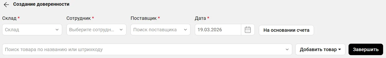 - Выбрать склад, сотрудника, поставщика и дату