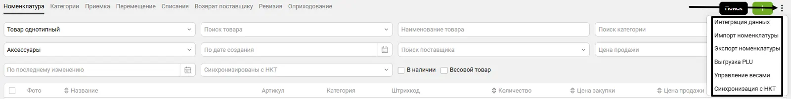Вам открывается дополнительный функционал раздела Номенклатура.