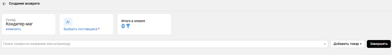 Wipon КонсольТоварыВозврат ПоставщикуСодержание этой страницыВсемТоварыПоставщикиВозврат поставщику Назначение Возврат Поставщику нужен для проведения возврата товаров поставщику. Причины Возврата Бракованный Товар. Просроченные Позиции. Несоответствие. подсказкаПо завершению Возврата - указанные товары будут списаны.