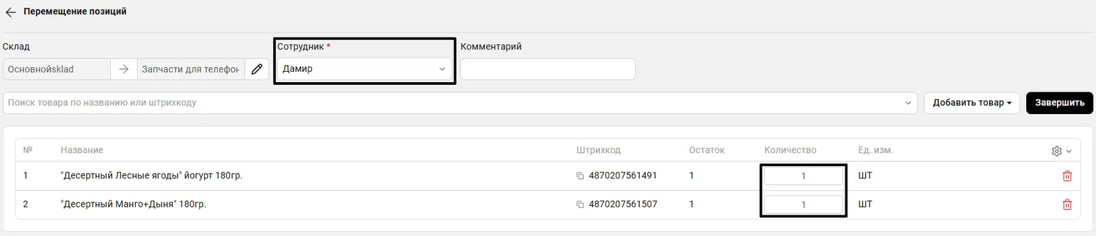 - Внесите подлежащие переносу позиции товаров и их количество.