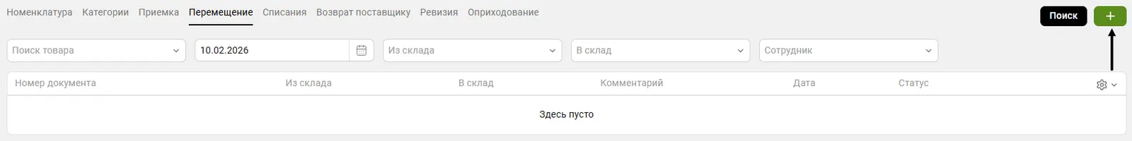 Раздел используется для перемещения товаров между складами в программе. При наличии 2-ух и более складов вы можете переносить остатки товаров со склада на склад.