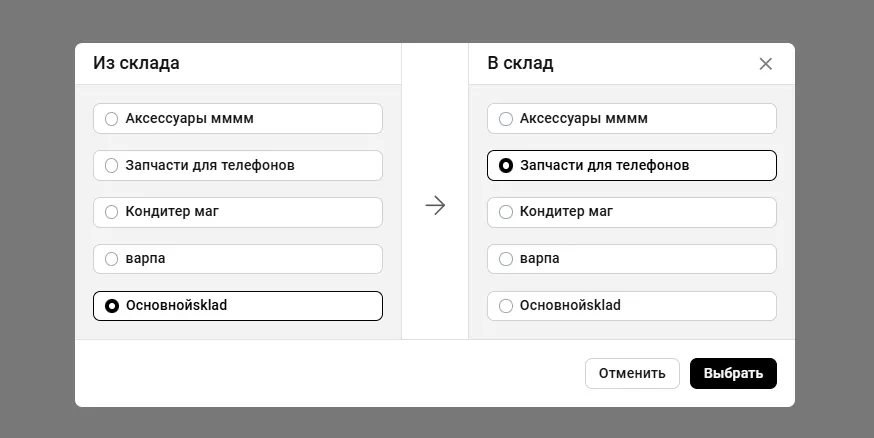 - Выберите склады, Откуда - Куда
