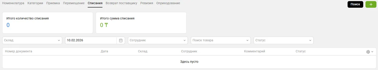 - Перепроверьте правильность внесенных данных, после проведения Списание не отменить.