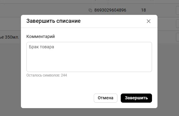 - Нажмите Завершить и укажите комментарий/причину проведения.