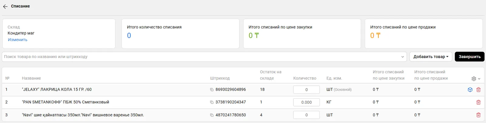 - Добавьте нужные позиции и количество подлежащее списанию.