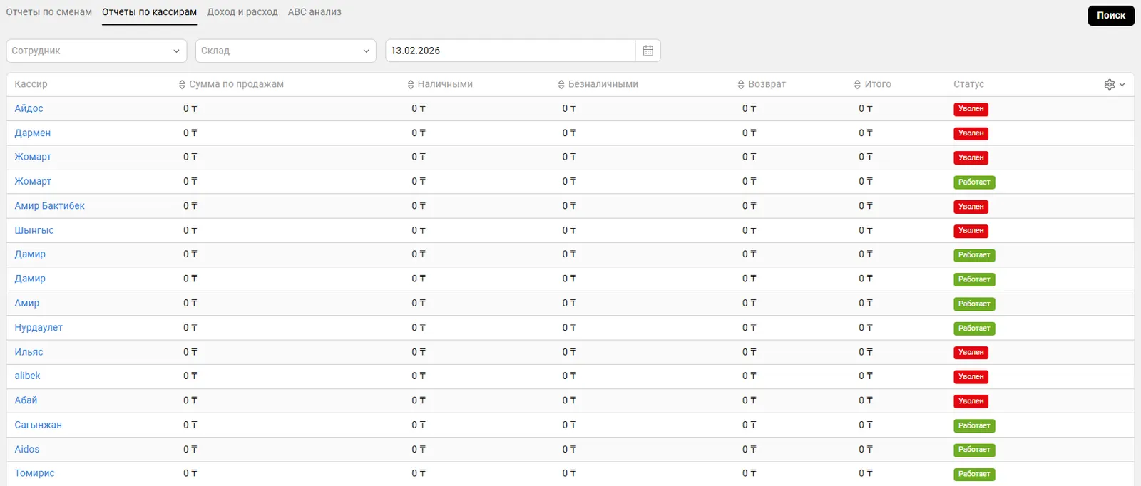 Wipon КонсольОтчетыОтчеты по КассирамСодержание этой страницыОтчетСотрудникиОтчёты по кассирам Отчёт отображает показатели по каждому кассиру отдельно. Показатели Продажи (нал / безнал) - сумма продаж Возвраты - сумма возвратов Итого - итоговая сумма продаж Статус (действующий / бывший) - статус сотрудника Фильтры Сотрудник - по сотруднику Склад - по складу Дата - по дате Статус - по статусу