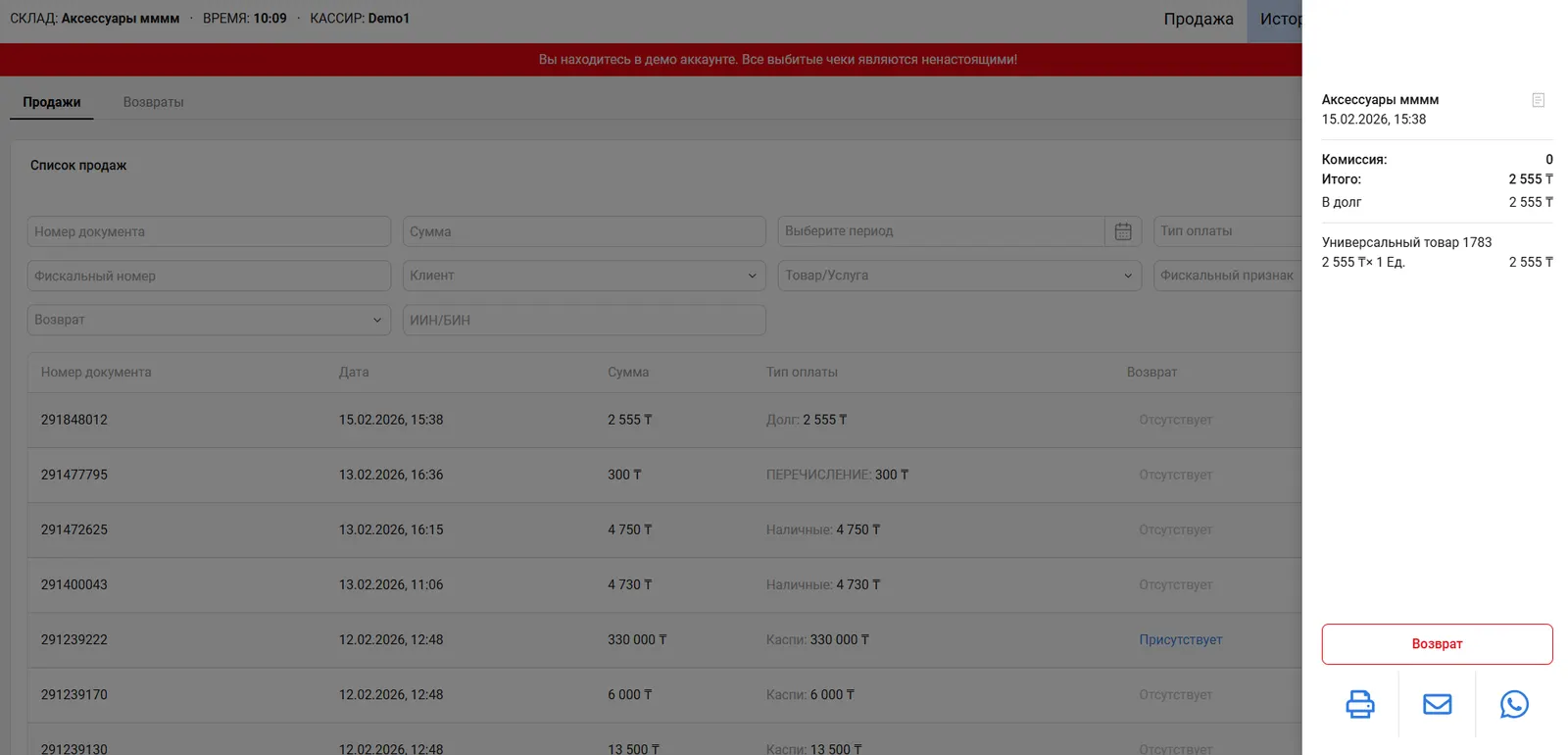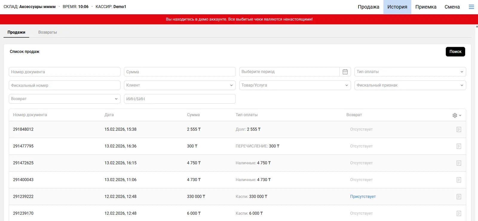 Раздел Режим Продаж предназначен для просмотра истории продаж и возвратов.