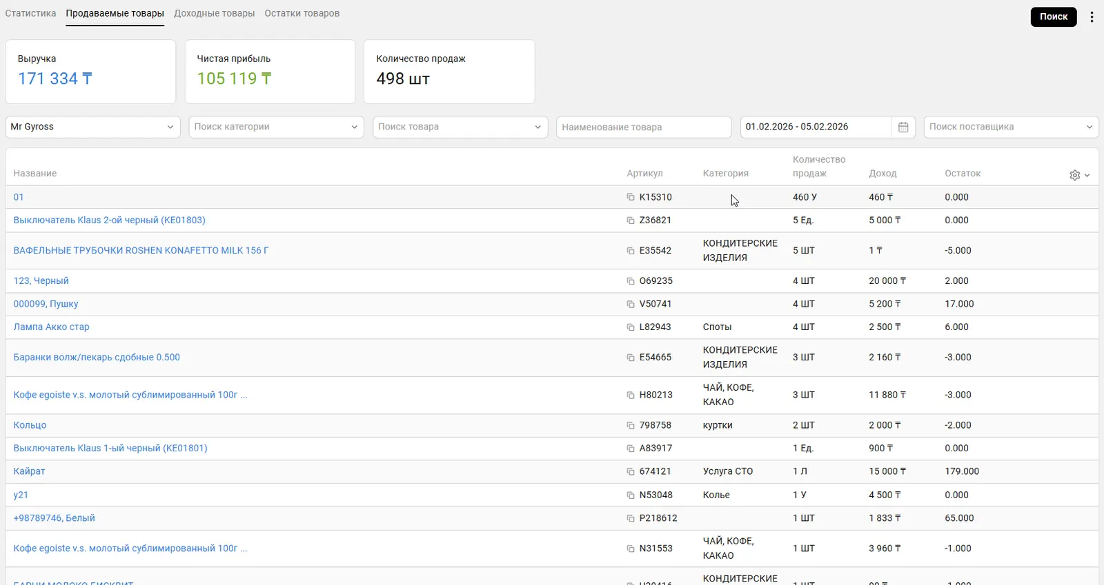 «Сатылған тауарлар» беті таңдалған кезеңде ең жиі сатылған өнімдерді талдауға арналған.