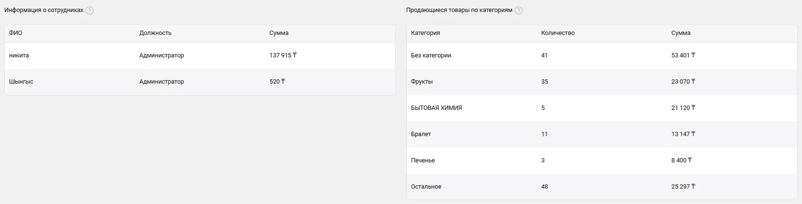 Сол жақта әрбір Қызметкер бойынша қайтаруларды қоспағанда, сату статистикасы көрсетіледі. Оң жақта жиі сатылатын тауарлардың Санаттары туралы ақпарат бар.