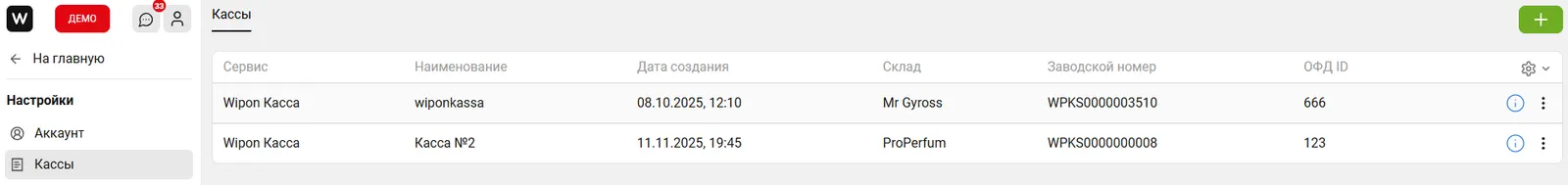 Касса бөлімінде сіздің шотыңызбен байланыстырылған барлық онлайн-кассалық машиналар тізімі көрсетіледі. Бұл бөлімде кассалар болмаса, чектерді фискализациялау мүмкін емес.